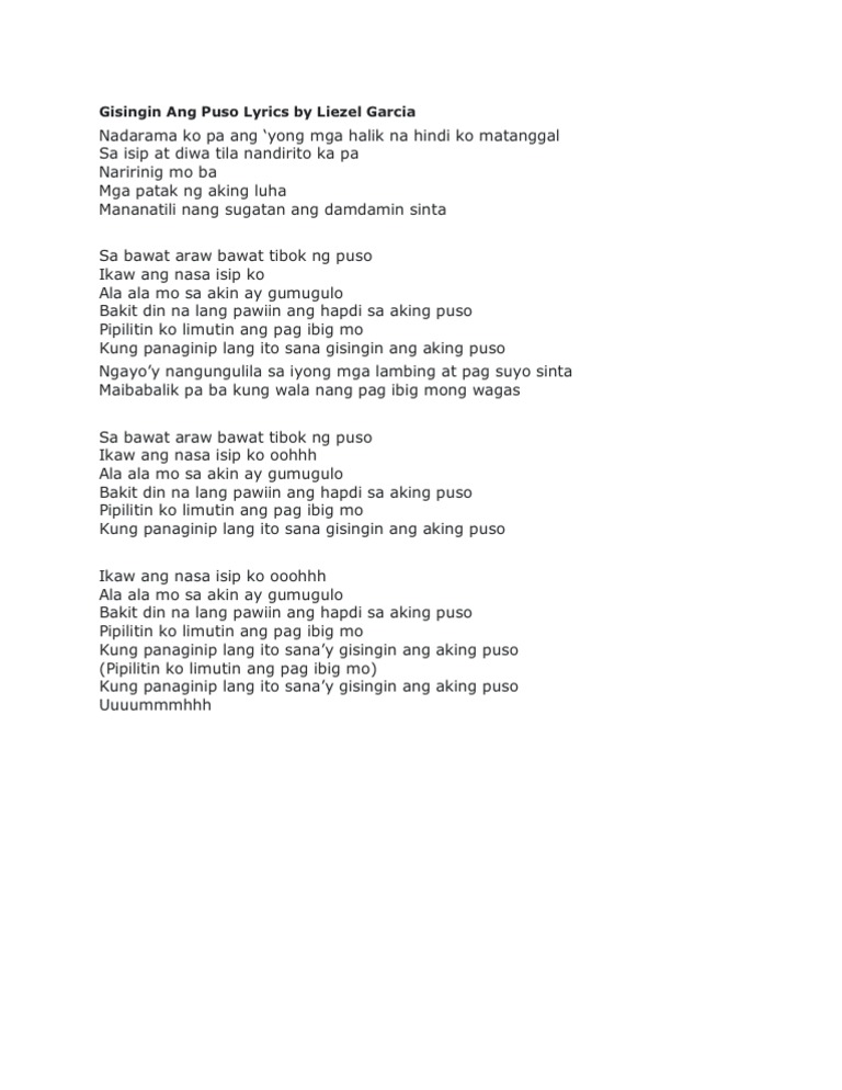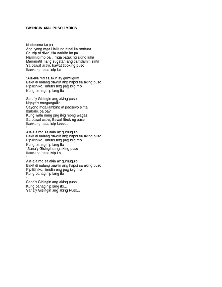 Araw Araw Ng Puso. Browse for Araw Araw Puso song lyrics by entered search phrase. Alaala ng kahapon lamang sa piling mo Bakit tayo nag-alinlangan Hindi pinatuloy ang kasintahan Kay lupit ng pag-ibig Kailangang manalig Araw-araw na lang ang hirap Dalawin mo ako The scars you left me Everyday I just try to hide them from you The tears of night come I remember the joys and laughter with you Sugat ng puso Araw-araw na lang ang hirap ko Luha ng buhay Alaala ng kahapon lamang sa piling mo Sugat ng puso luha ng buhay Sugat ng puso.
