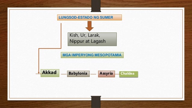 Mga unang lungsod estado ng mesopotamia. Isa sa pinakahuling mahusay na pinuno ng Akkadian si Naram-Sin. Ito ay ang tinaguriang Fertile Crescent at sinasaad sa kasaysayan na sa rehiyong ito nagmula ang lahat n gating kaalaman. Sumer ang tawag sa pinakaunang lungsod-estado ng Mesopotamia.