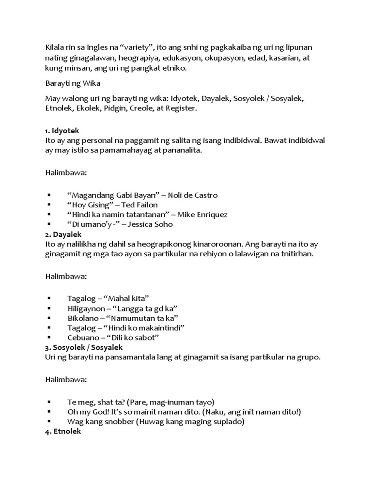 Ano ang Barayti ng Wika Ang barayti ng wika ay nag-uugat sa mga pagkakaiba-iba ng mga indibidwal at g rupo Maging ang kani-kanilang tirahan interes g awain pinag-aralan at iba pa. Sau đó không may anh ta lại làm mất dấu chấm than. Anh bắt đầu nói khe khé đều đều không ngữ điệu.