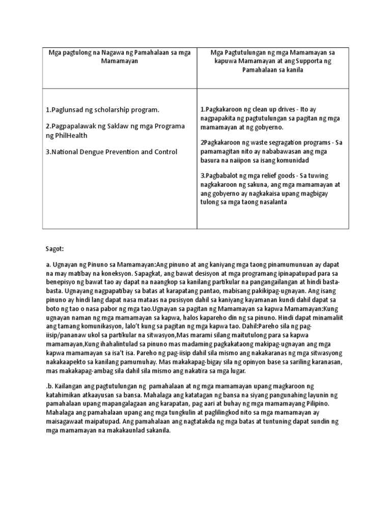 Pagbabayad nang tamang buwis ng mga mamamayan upang magkaroon ng pondo ang pamahalaan. Pagpapatayo ng mga karagdagang silid- aralan- Sinisikap ng pamahalaan na makapagpatayo ng mga paaralan sa malalayong lugar maging sa mga tribo o lugar ng mga minoridad. Natutunan kong maging tapat sa mga tungkulin at upang maging isang mabuting mamamayan.