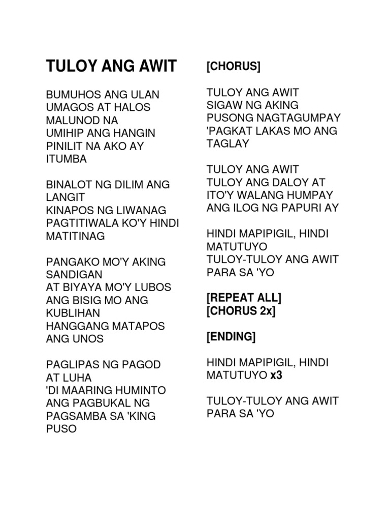 Pagkat tuloy pa rin kaya nang harapin ang mundo woh-hoh For it still goes on I can now face the world woh-hoh Tuloy pa rin ang awit ng buhay ko awit ng buhay ko. Lyrics of TULOY ANG AWIT by Musikatha. Intro G Dm7 C Csus C G Dm7 C Csus C Verse C CE BUMUHOS ANG ULAN F G C CE F UMAGOS AT HALOS MALUNOD NA G C CE UMIHIP ANG HANGIN F G C CE F PINILIT NA AKO AY ITUMBA Am F BINALOT NG DILIM ANG LANGIT CE DF KINAPOS NG LIWANAG Dm7 FM7 G PAGTITIWALA.