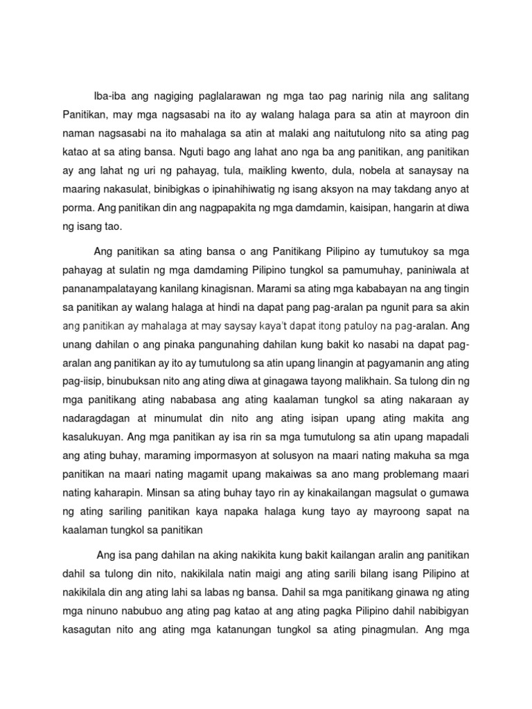 Sa pamamagitan ng panitikan ating maipapakita at naipapakilala ang ating kultura. 1Upang makilala ang kalinangang Pilipino malaman ang ating minanang yaman ng kaisipan at taglay na katalinihan ng lahing ating pinagmulan. Ang ekonomiks ang nagbibigay ng kapanatagan sa bawat isa na magkakaroon tayo ng trabaho at magandang buhay sa kinabukasan.