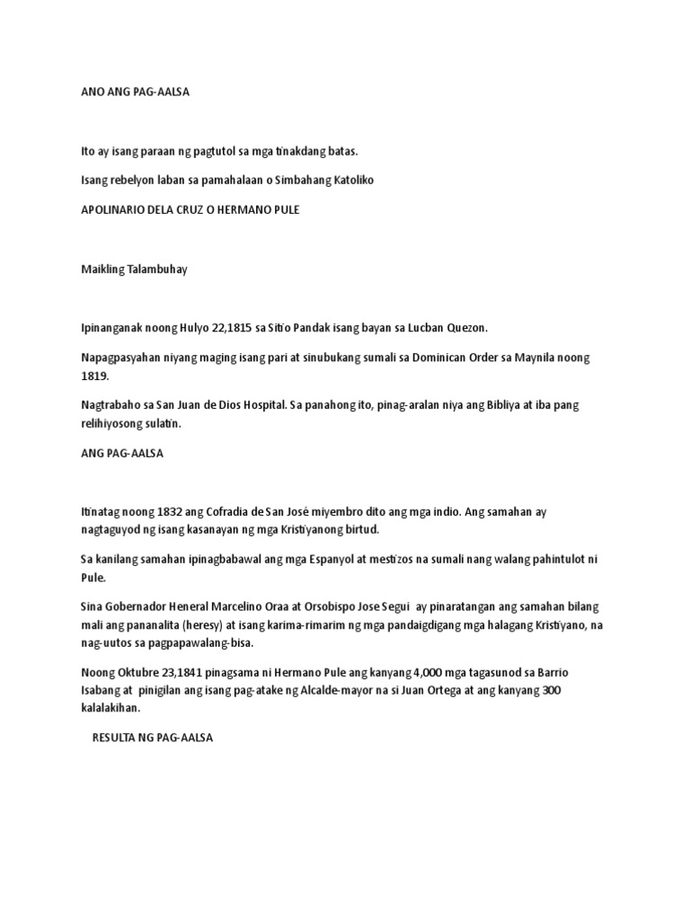 Araling Panlipunan 28102019 1728 calmaaprilgrace. Hulyo 22 1814 - Nobyemre 4 1841 Hermano Pule ay si Apolinario dela Cruz. Karamihan ng mga kasapi nito ay mga magsasaka at ito ang naging kapalit ng Katolisismo.