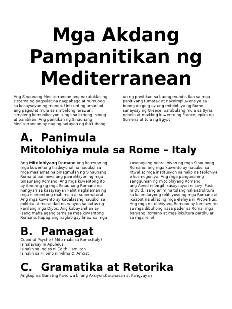 Panitikang MediterraneanPanimula at mga Pokus na TanongIsa sa pinakamasining na pamamaraan upang makilala ang kultura ng isangbansa ay sa pamamagitan ng panitikan. PANITIKANG MEDITERRANEAN AT PANITIKANG PILIPINO. Dahil dito mas napamahal at mas nabigyan din ng pansin ang kultura natin.